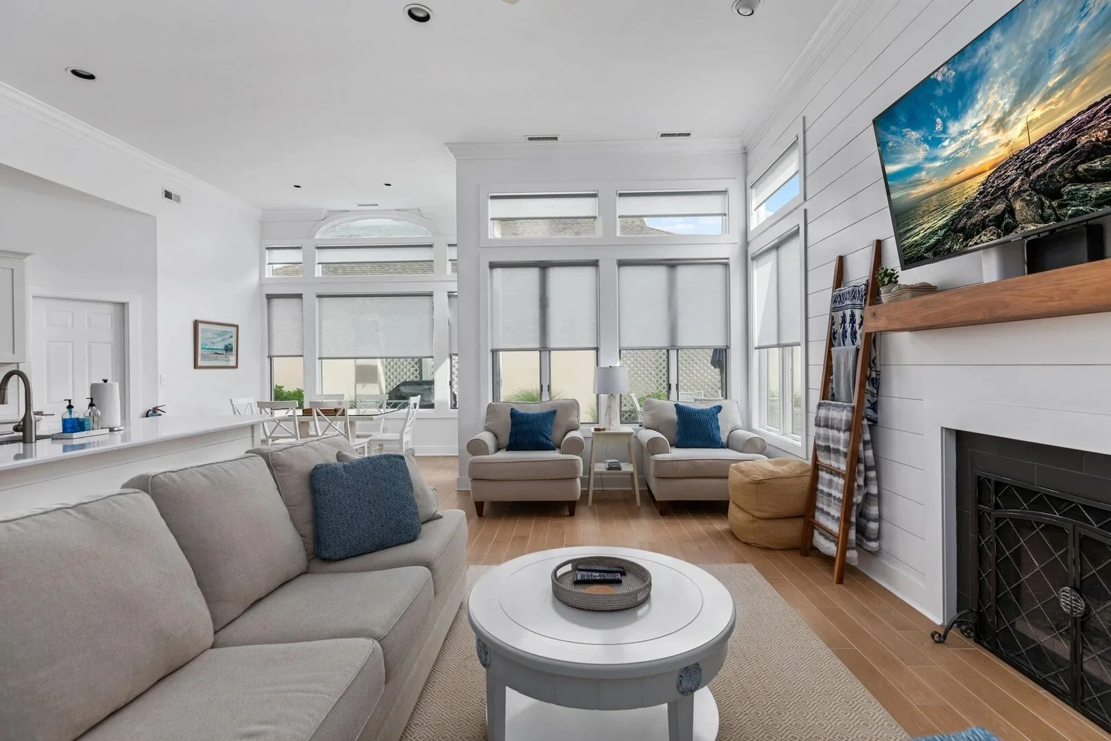 Enjoy the inviting great room, designed for comfort and connection. High ceilings create an airy, open atmosphere, while a plush sectional with a queen-size pull-out bed and oversized chairs with ottomans provide flexible seating and restful sleeping space. A smart TV with your favorite streaming apps and basic Xfinity cable ensures easy entertainment. Cozy throw blankets and a selection of family-friendly games add warmth and fun. Motorized shades on every window and a ceiling fan keep the space cool and comfortable during summer.
