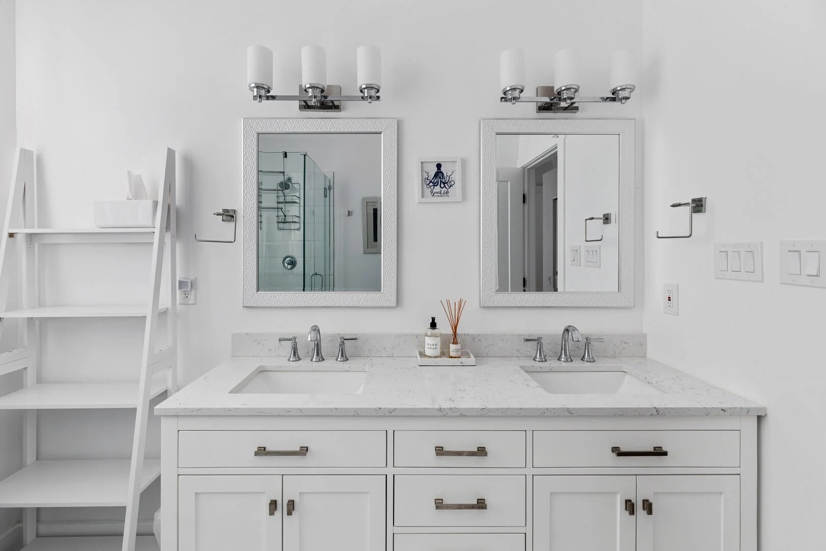 In the primary en-suite, an elegant double vanity with generous storage drawers and an open shelving display complements a sleek glass-enclosed shower for a clean, spa-like retreat.