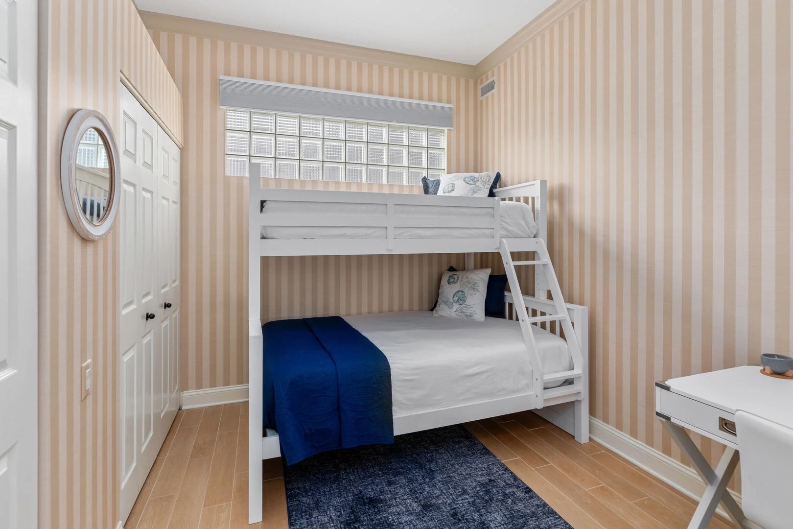 This cozy bedroom features a twin-over-full bunk bed—perfect for kids or extra guests—plus a dedicated workspace with a desk and comfortable chair. Two spacious closets have been upgraded with custom organization systems for easy storage during your stay.