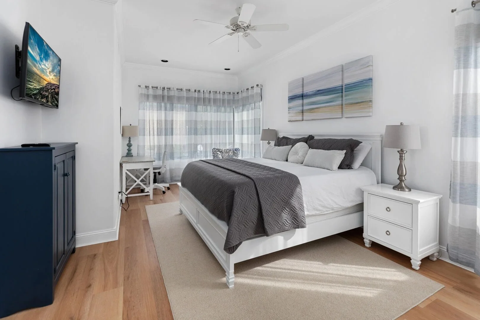 This spacious primary suite invites relaxation and convenience. It features a king-size bed with matching nightstands, a dresser, a work-ready desk, and a comfortable upholstered armchair—perfect for reading or unwinding. The oversized closet was recently upgraded with a custom closet system for organized storage and easy access. Enjoy entertainment on the smart TV, and stay comfortable with the ceiling fan. The suite is completed by a private en-suite bathroom for added privacy and ease.