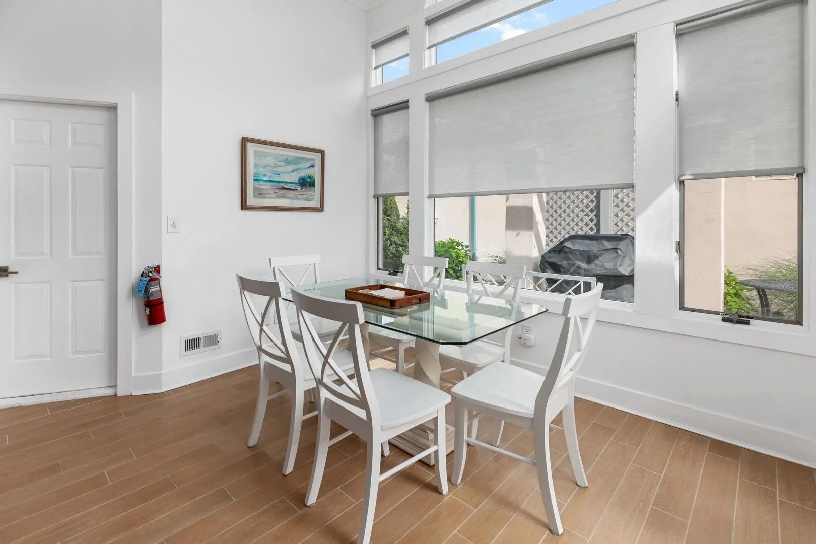 The dining area comfortably seats six, creating an inviting spot for family meals, game nights, or relaxed conversation. Large windows bring in natural light while motorized blinds let you easily control sun and privacy—open them for a clear view of the backyard patio or lower them for a shaded, cozy atmosphere.