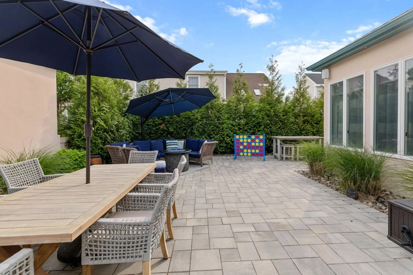 Enjoy a beautifully appointed, fully pavered backyard designed for effortless relaxation and socializing. Dine alfresco at the covered dining area for six, or gather at the outdoor bar with six stools for cocktails and conversation. Cozy up around the fire pit seating area after sunset, grill fresh meals on the propane barbecue, and rinse off from the beach in the convenient outdoor shower. A selection of outdoor games keeps everyone entertained, while lush, thoughtfully arranged gardens frame the patio and create a peaceful, private atmosphere.