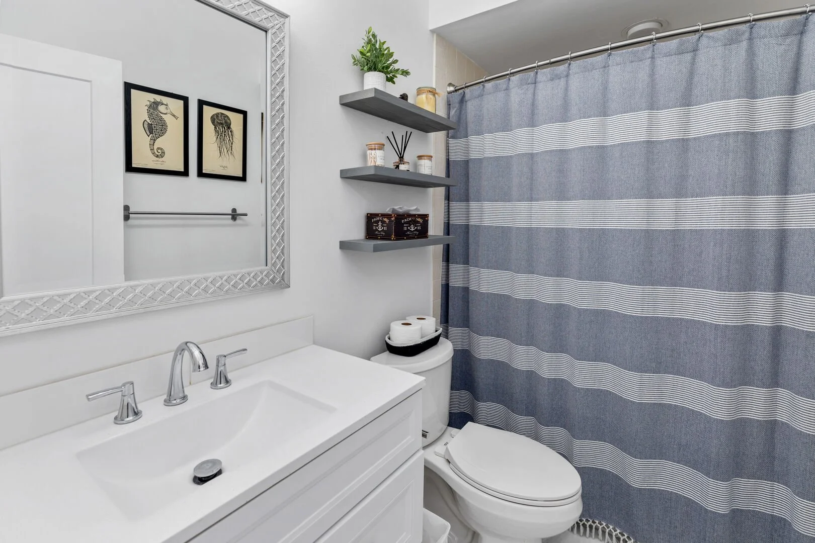 This bright, conveniently located shared bathroom features a single vanity with ample storage and a full bath/shower combination — perfect for relaxing soaks or quick rinses after a day of exploring. Clean, well-supplied, and easy to access from the common areas.